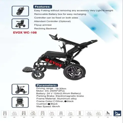 This aluminium alloy electric power wheelchair features an electro-magnetic brake system and supports up to 250 Lbs. Maximum speed is 6 km/h.