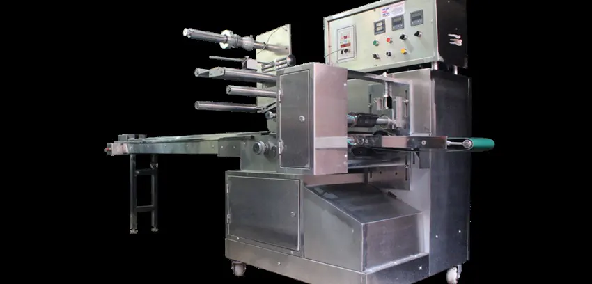 Flow wrap machine for facemasks with heat seal closure. Features 4 wheels for horizontal packing. Ideal for efficient mask packaging applications.