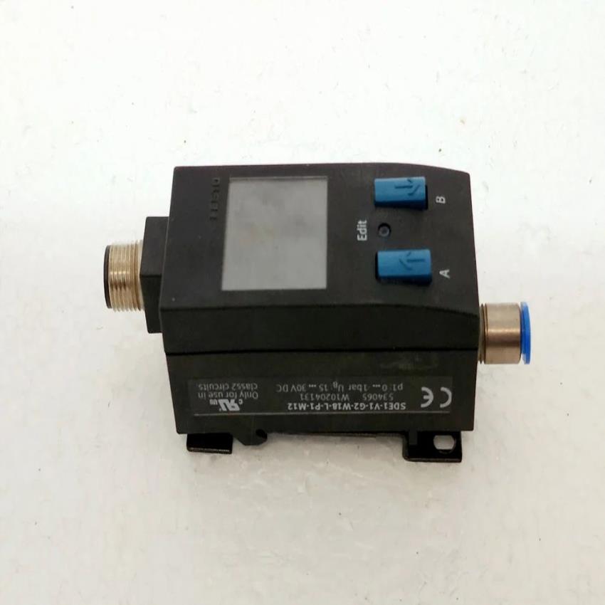 Festo pressure sensor, model SDE1-V1-G2-W18-I-P1-M12. Operates within 0-1 bar pressure range, 15-30 V DC voltage. High accuracy, M12 connector.