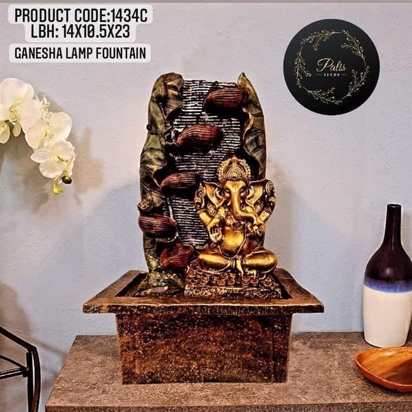 Decorative fiber Ganesh fountain in brown. Ideal for home decor. Dimensions: 14x10.5x23 inches. Product code: 1434C. Minimum order quantity of 50 units.