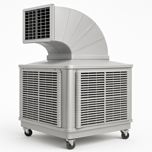 Fiber duct air cooler with 2 HP power and 50L tank capacity. Covers 200 SQM, consuming 12-20 LPH water. Input power: 2.2 kW.