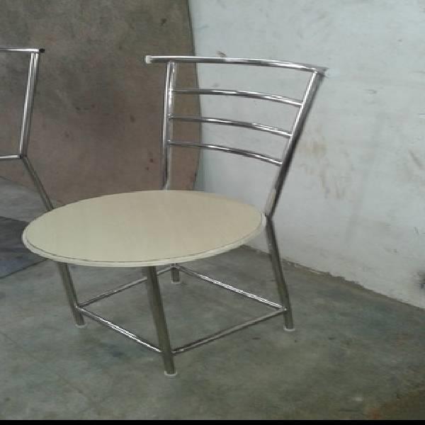 Silver, polished stainless steel chairs. Foldable design suitable for cafe use. Packaged in a cart for convenient transport and storage.