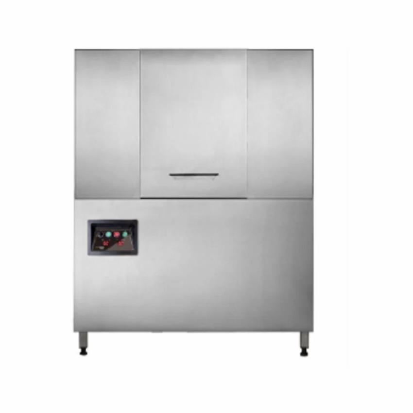 Freestanding rack conveyor dishwasher for commercial applications. Stainless steel construction, 12 place setting capacity. Consumes 10 liters of water per cycle.