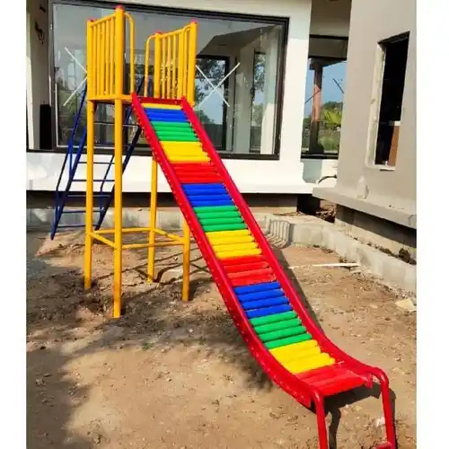 Durable FRP roller slide for playgrounds, suitable for ages 10 years. Features vibrant yellow, red, green, and blue colors for engaging play.