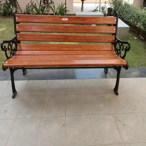 Wooden and CI garden bench, rectangular shape, brown color. Dimensions are 5 feet length and 1 foot width. Suitable for outdoor garden use.