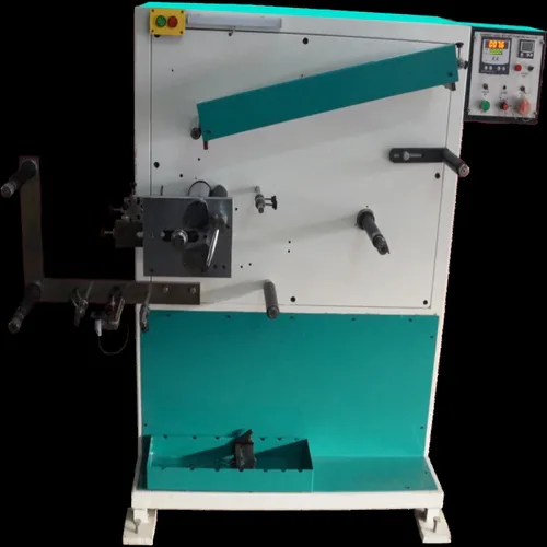 Manual rotary machine for printing labels on satin & taffeta. Features 1 color printing, 150mm printing width, and max length of 0-500mm. Made in India.