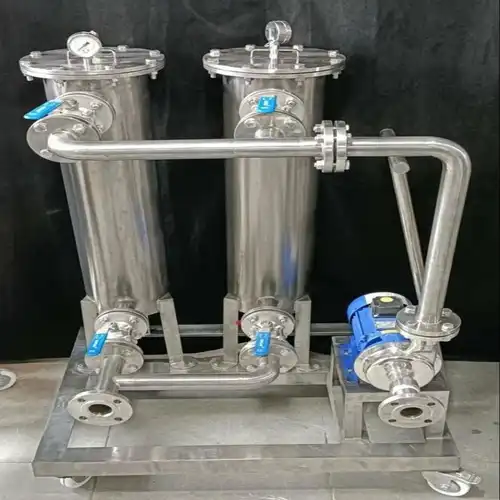Silver glass fiber duplex filter, 20-inch capacity. Operates on 230V or 420V AC for the pump, using filter bags or cartridges. Continuous service range.