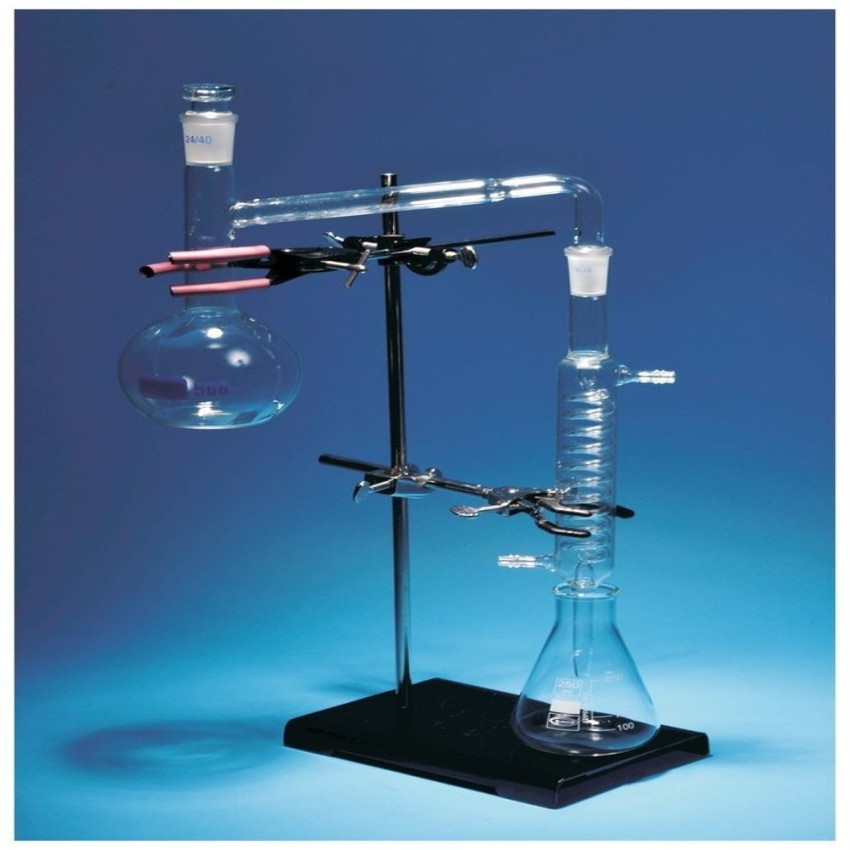 Glass distillation apparatus for laboratory use. Features a flask component, constructed from durable glass material. Ideal for various laboratory distillation procedures.
