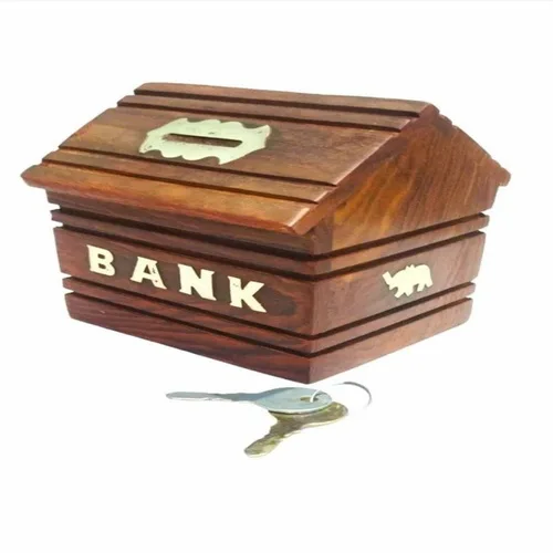 Handmade glossy brown wooden money box for personal use. Features one slot and a lock with keys. Suitable for children aged 4-6 years.