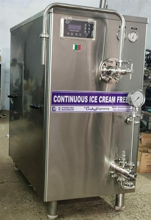 Medium size stainless steel continuous ice cream freezer with 400L capacity. Automatic grade, 8000W power consumption, 415V, three-phase. Dimensions: 900x1350x1350 mm.