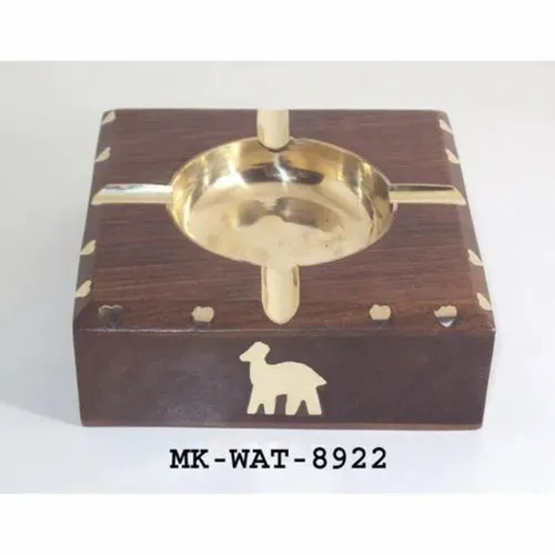 Square ashtray crafted from wood and brass. Features a dual-tone wooden and golden finish. Ideal for home or office use.