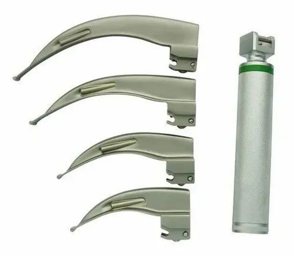 Reusable fiber optic laryngoscope blades. Manual automation grade. Non-sterilized. Includes four blades for medical use. Durable construction for professional applications.