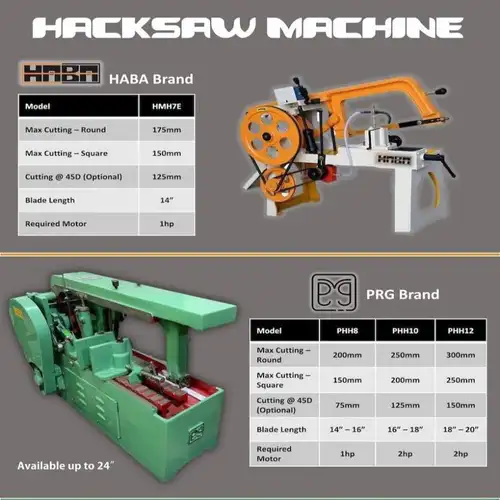 A green hydraulic hacksaw machine made from cast iron. It supports cutting blade sizes from 8 to 20 inches and includes a 1-year warranty.