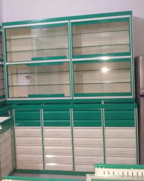 This medical display rack features 6 shelves made from MS sheet, pipe, aluminum, glass, and ACP sheet. It measures 94" high, 3ft long, and 16/10" deep, supporting 0-50 kg per layer.