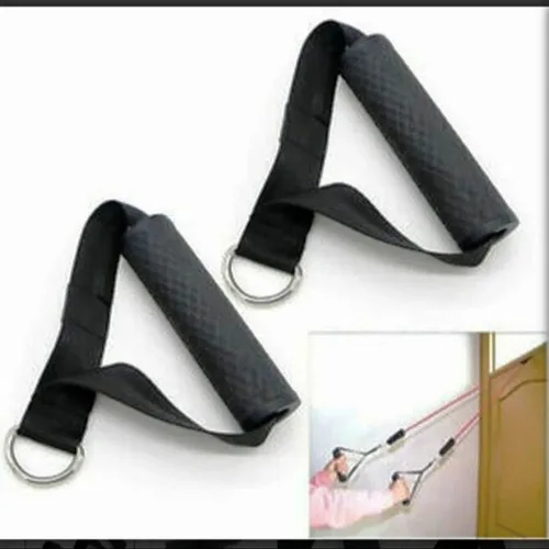 Black metal D handle with strap for gym use. Features a standard size and durable construction. Ideal for various strength training exercises.
