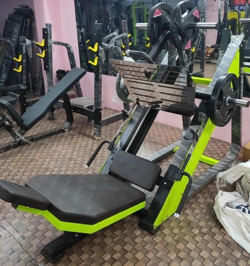 Leg press machine for gym use. Features leather seat, color coated finish, and weight stack resistance. Size: 1910x500x1550 mm.
