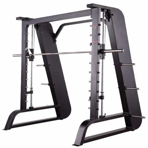 Commercial gym Smith Machine in Black and Yellow, MS construction with polished finish. Features weight stack resistance, adjustable seat, and targets all muscles.