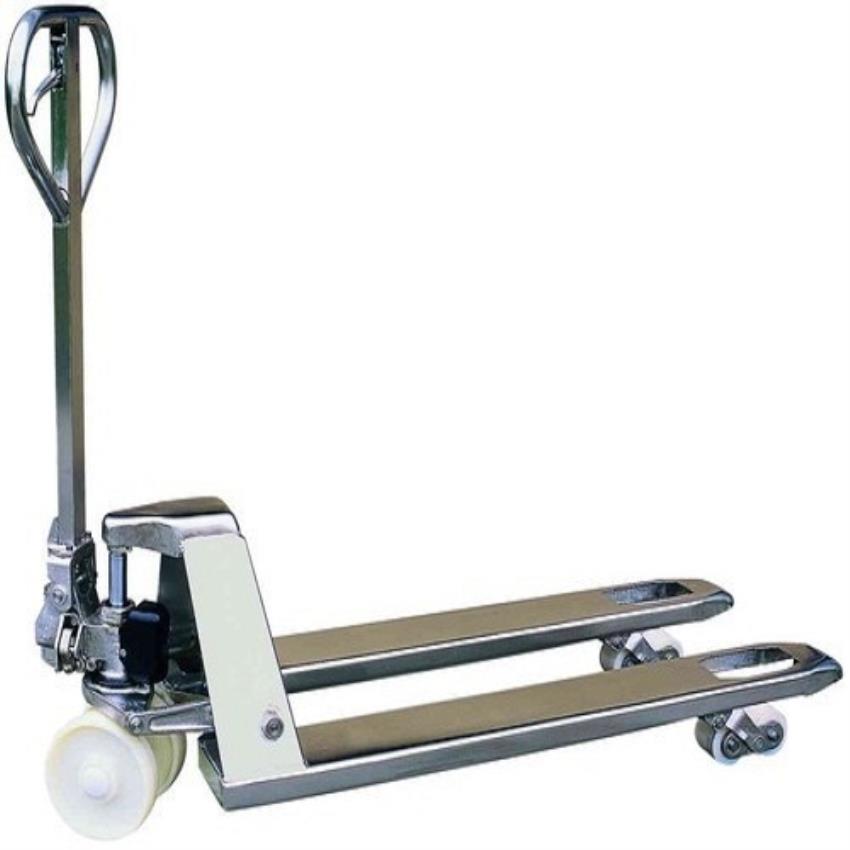 Industrial hand-operated hydraulic pallet truck with a 1000 Kg loading capacity. Features 80 cm fork width and a maximum lifting height of 1600 mm for efficient material handling.