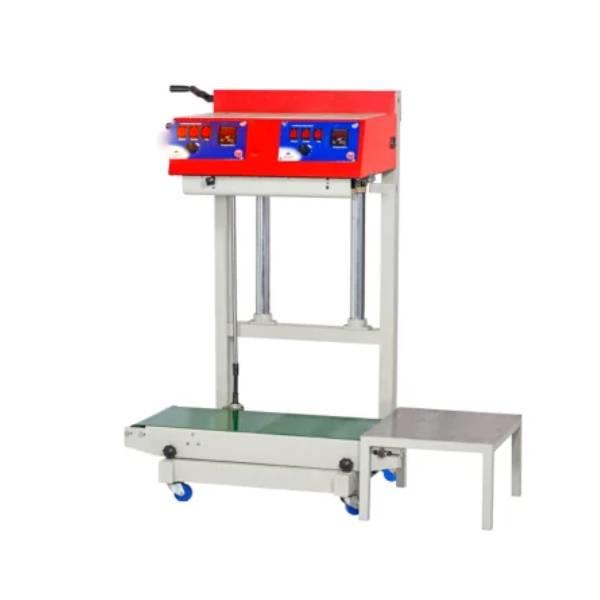 This heavy-duty continuous bag sealer operates on 1 PHASE, handles up to 15 KG, and features a 12 mm sealing width. Dimensions: 22" x 41" x 46", Weight: 30 Kg.