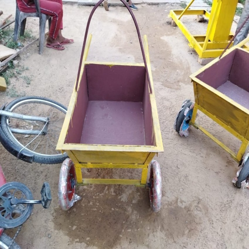 Yellow double wheel barrow with a 150 kg load capacity. Features two wheels for enhanced stability and ease of movement. Made in India for reliable material transport.