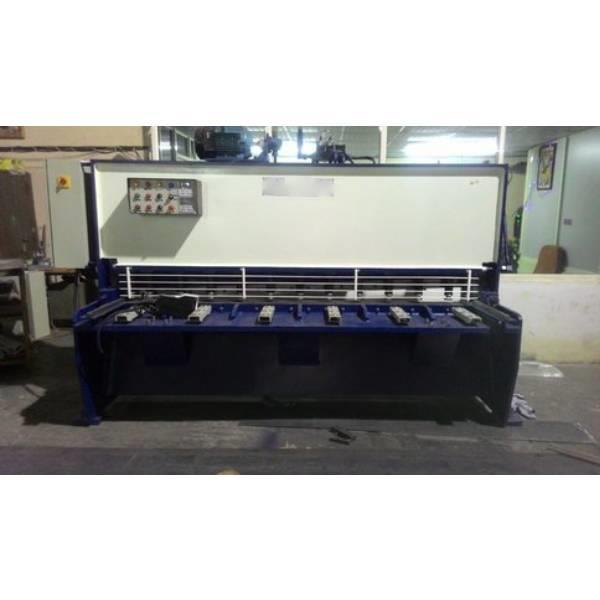 Semi-automatic hydraulic machine for metal sheet cutting. Cuts 0.5mm to 25mm thick mild and stainless steel up to 6300mm width. 7.5HP motor, 13 hold-downs.