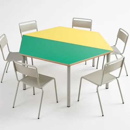 Hexagonal table and 6 chairs set available with a minimum order quantity of 5 pieces. Ideal for various commercial or event applications. Durable construction for repeated use.
