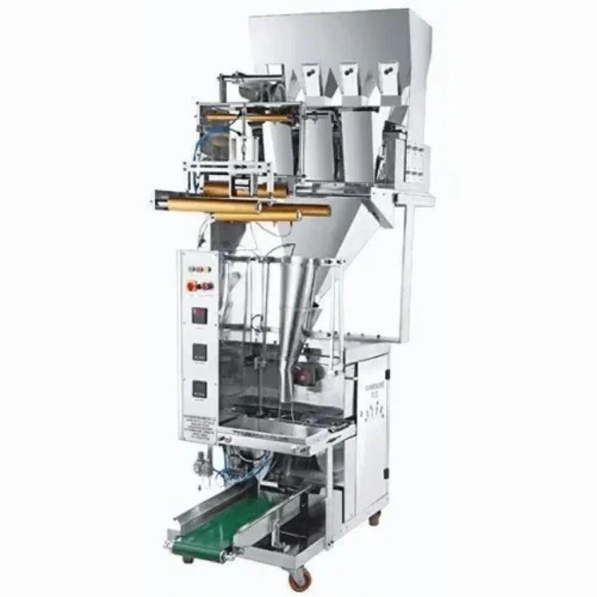 This automatic Indian machine packages rice and whole spices into pouches. It runs on 220-240V, 50Hz, with a 0.5 HP main motor, delivering 1500 pouch/hour capacity.
