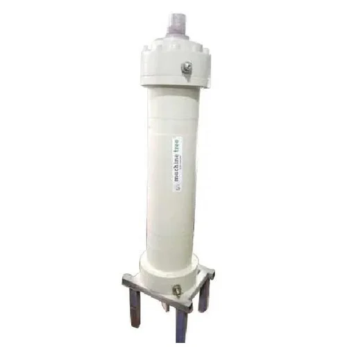 White mild steel double acting hydraulic cylinder. 50 Ton capacity with a maximum stroke of 2000 mm. Designed for high-pressure applications. Robust construction.