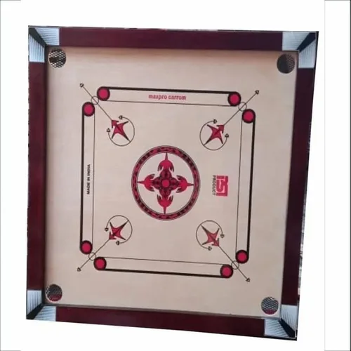 Medium-sized square wooden carrom board for home use. Features 8mm ply thickness and accommodates up to 4 players. Not waterproof.