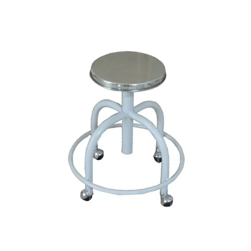 Adjustable hospital revolving stool (18-27") with MS/SS construction, epoxy powder coated finish. Features a 30 cm tabletop diameter and is designed for clinical use.