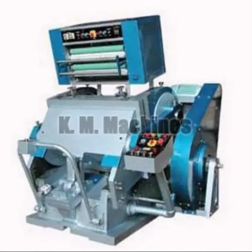 Platen die cutting machine with hot foil stamping capabilities. Designed for efficient and precise cutting applications in industrial settings.