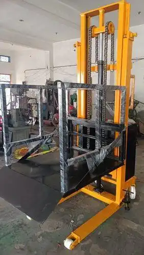 Industrial hydraulic order picker, semi-automatic function type. Constructed from mild steel with DC power supply. Features a 12-month warranty. Made in India.