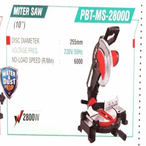 Indian-made miter saw machine with a 10-inch cutting blade and 2800 watts power consumption. Suitable for aluminum applications. Sold new, minimum 1 unit order.
