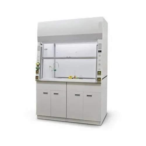 Stainless steel chemical fume hood manufactured in India. Operates on 230V, 50Hz, ensuring effective fume extraction for laboratory applications.