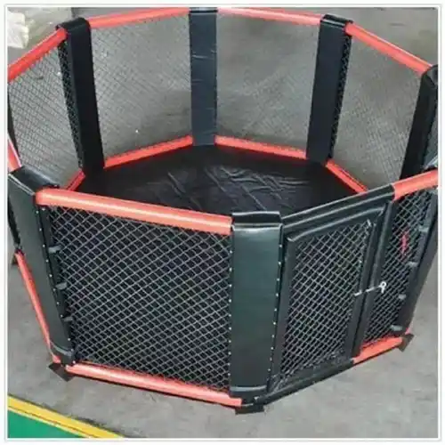 MS Steel MMA cage, 30 ft diameter with 6 ft high fence, sits on a platform. Customizable size and color options available for professional combat sports.
