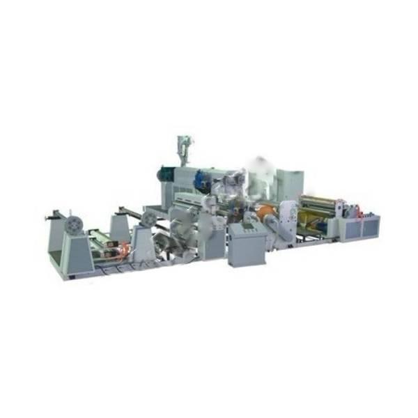 Automatic lamination machine for LDPE PP resin coating up to 1600mm width. Operates at 110m/min with 220kg/hour extruder capacity, using 3-phase power.