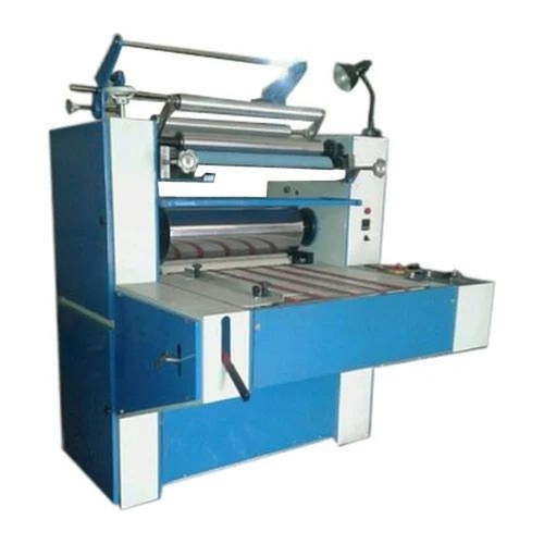 This industrial film lamination machine is constructed from steel. Powered by electricity, it operates at 220 V and 50 Hz, ensuring reliable performance for industrial applications.