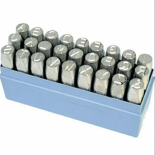 Durable letter punches for industrial applications, featuring a silver finish and robust construction. Designed for various stamping needs, ensuring consistent results. Ideal for diverse manufacturing environments.