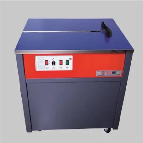 Semi-automatic industrial strapping machine operating at 230V, 50Hz. Features MS construction, 2.5 sec/strap speed, and electric power source. Designed for efficient, high-volume packaging applications.