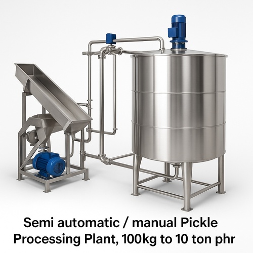 Semi-automatic/manual industrial pickle processing plant with 100kg to 10 ton/hour capacity. Stainless steel construction, GMP design, runs on 220-410V. Batch type with manual/automatic unloading.