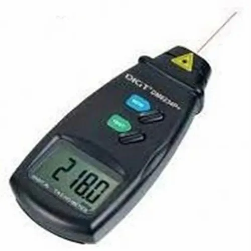 Plastic, non-contact digital tachometer for industrial use. Measures rotational speed from 0 to 5000 RPM.