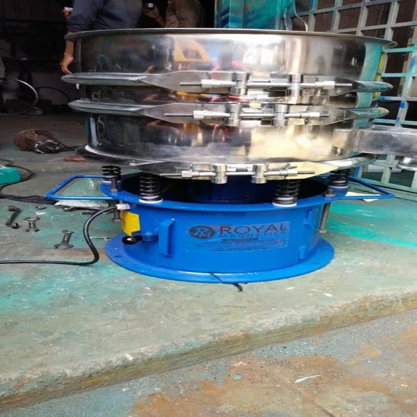 Powder sieving machine constructed from SS and MS materials. Features 3-phase power and a production capacity of 500 kg/hr. Dimensions are 24 inches.