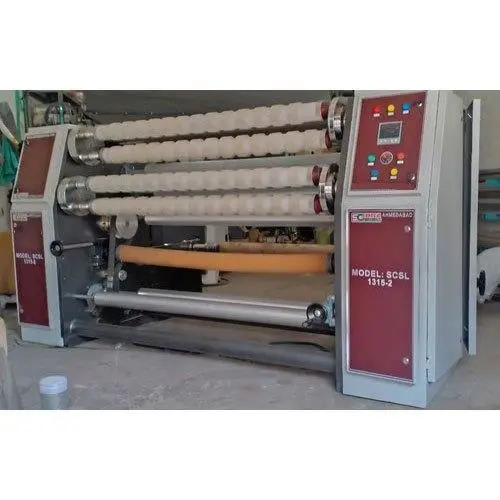Electric industrial tape cutting machine, 5 HP, 415V, 50-60 Hz. Mild steel construction with 110 mtr/m production capacity. Suitable for 1 or 3 phase power.