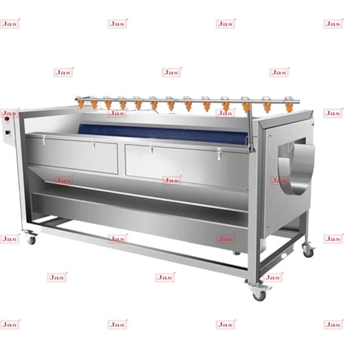 Industrial vegetable washing equipment with 250-2000 kg/hr capacity and 900 mm brush length. Supports single/three-phase power supply (230/440 volts).