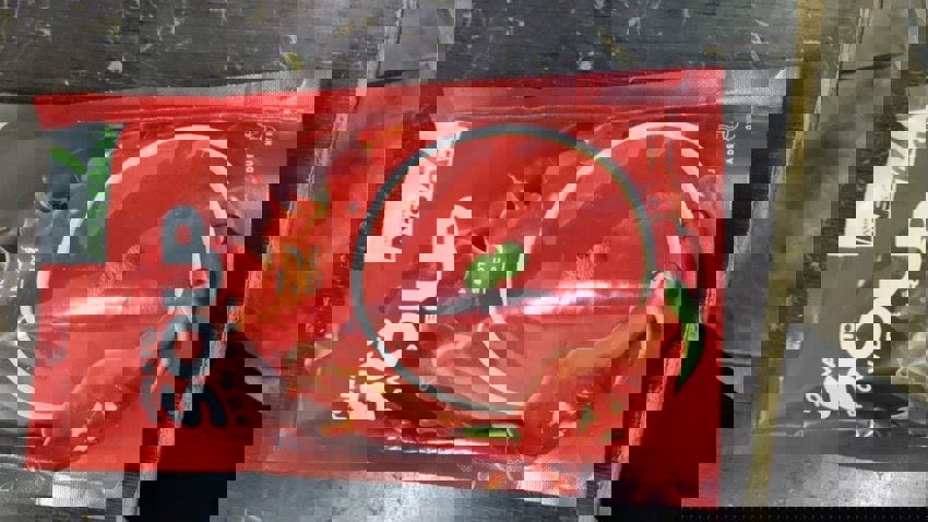 Red tomato soup powder packet designed for vending machine use. Provides a convenient and quick beverage option.