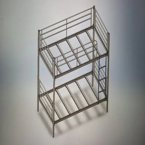 Iron double bunk bed, black. Features built-in ladder and side railing. Supports 30kg per bunk. Delivered in knock-down condition.