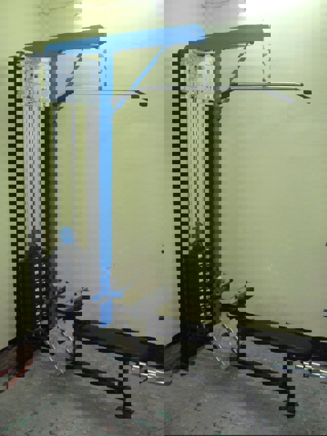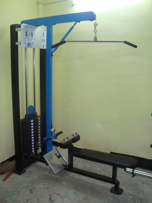 Manual iron lat cum rowing gym exercise machine, weighing 80 kg. Designed for gym use with a 1-year warranty. Ideal for comprehensive upper body workouts.