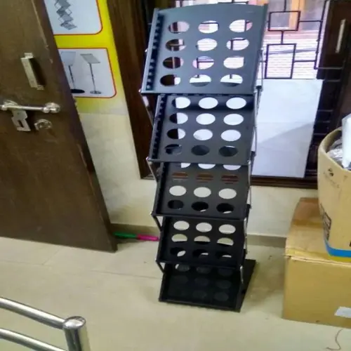 Iron magazine stand, 4.5 feet height, suitable for all uses. Available in brown/black. Features open shelving and a production capacity of 100 units.