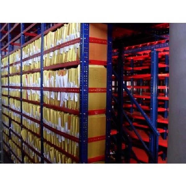 Color-coated iron multi-tier storage rack for warehouses. Features corrosion resistance and 12 feet height, providing 1500 kg storage capacity. Durable construction for industrial use.