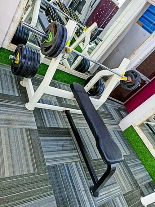 Iron flat bench designed for gym use. Supports a maximum user weight of 120 kg. Made in India.